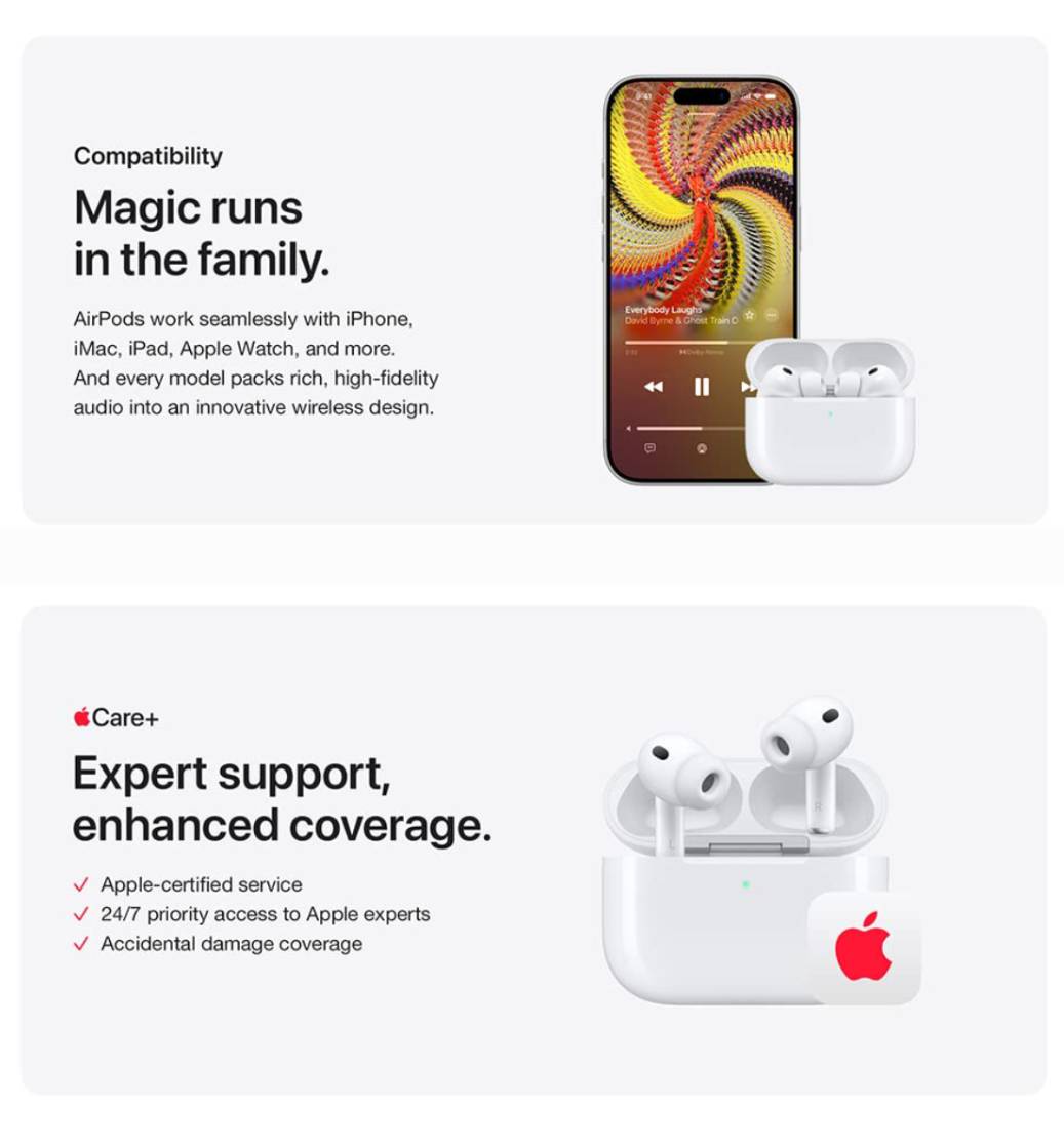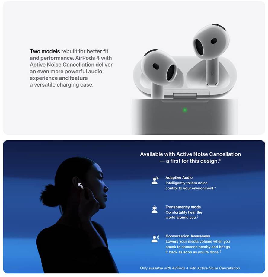 Just say “Siri” or “Hey Siri” to play a song, make a call, or check your schedule.* And with Siri Interactions, now you can respond to Siri by simply nodding your head yes or shaking your head no.* Pair AirPods 4 by simply placing them near your device and tapping Connect on your screen.* Easily share a song or show between two sets of AirPods.* An optical in-ear sensor knows to play audio only when you’re wearing AirPods and pauses when you take them off. And you can track down your AirPods and Charging Case with the Find My app.*