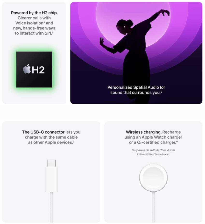 Personalized Spatial Audio with dynamic head tracking surrounds you with rich, theater-like sound for music, movies, games, and more. Powered by Apple’s H2 chip, AirPods 4 deliver improved sound quality and clearer calls, with Voice Isolation that reduces background noise and keeps your voice front and center—even in busy environments. Enjoy up to 5 hours of listening on a single charge, and up to 30 hours total with the charging case for all-day performance.