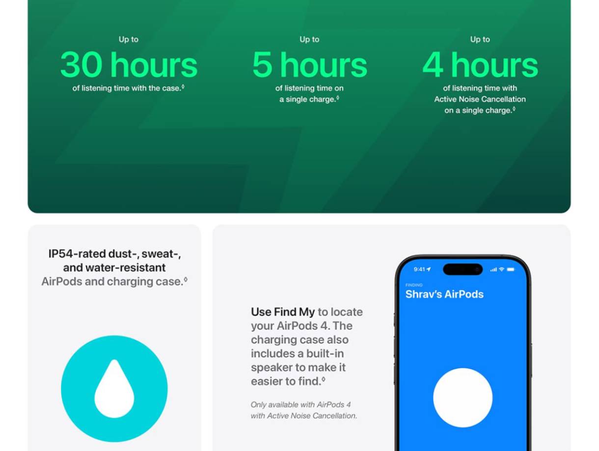 AirPods 4 and the Charging Case are rated IP54 dust, sweat, and water resistant, so they’ll withstand rain and heavy workouts.*
